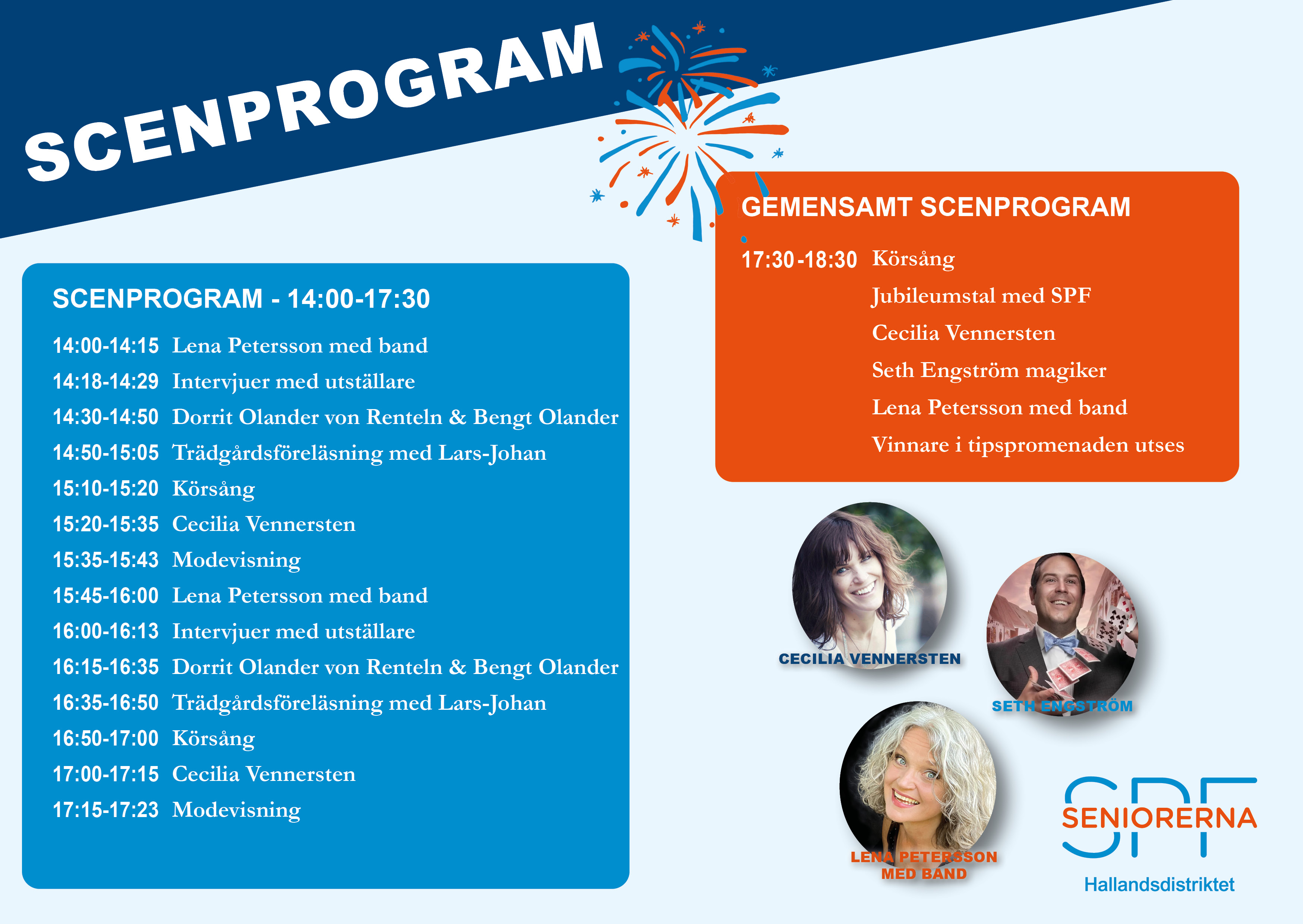 Mellan 14:00-17:30 kommer Societetsparken och dess omnejd att fyllas med roliga aktiviteter som ni kan prova, utställare att besöka samt ett öppet scenprogram att lyssna till. Här kan ni blanda annat lyssna på sång med Cecilia Vennersten. Gå en guidad stadsvandring med Peter Börjesson. Se den fantastiska utsikten med Strandtåget. Lyssna till intressant föreläsning med trädgårdsmästare Lars-Johan Svanström. Se på Dorrit och Bengt Olanders framträdande med nedslag i Halland och dess historia med sång, berättande och musik. Magi med kungens hovleverantör Seth Engström. Äta en smarrig fika. Testa på minigolf. Se framträdande med Lena Petersson med band. Prova på boule, lyssna till körsång och se på modevisning, med mera!