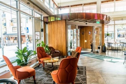 Alla rum på Scandic Hotel Portalen har en sitthörna och trägolv.