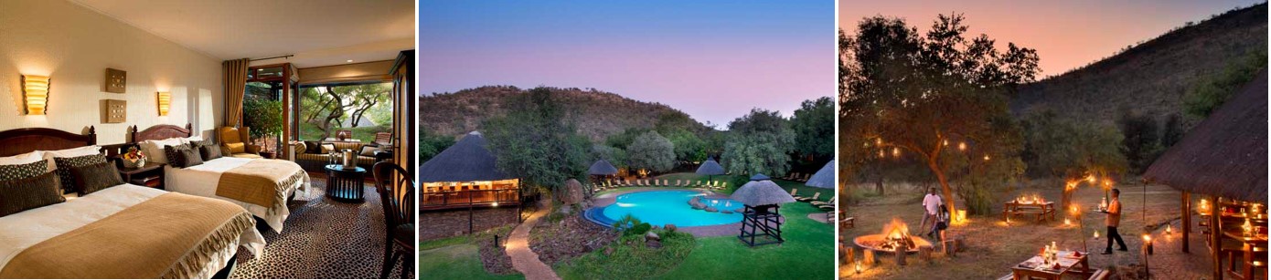 Rummen och restaurangen på Bakubung Bush Lodge vetter ut mot parken och ett vattenhål dit djur gärna kommer. Från hotellrummet kan du ofta se giraffer, elefanter, zebror mm när de vandrar in på området för att dricka.